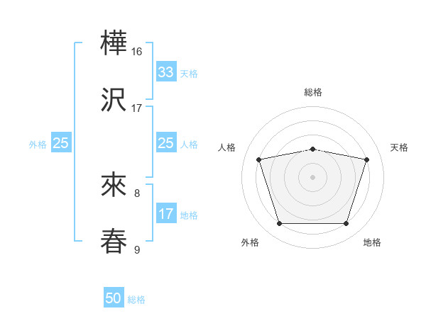 樺沢 來春さんの総格は50画の2点!