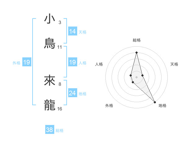 小鳥 來龍さんの総格は38画の4点!