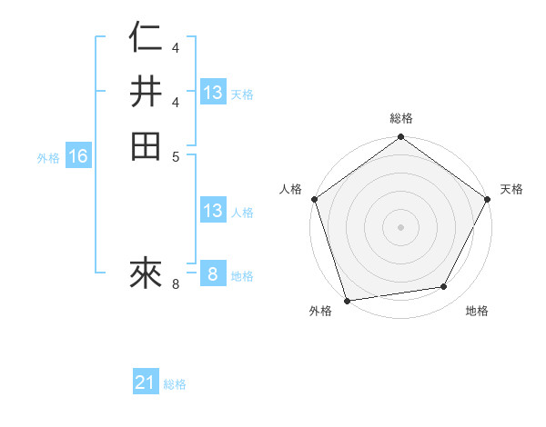 仁井田 來さんの天格は13画の5点!