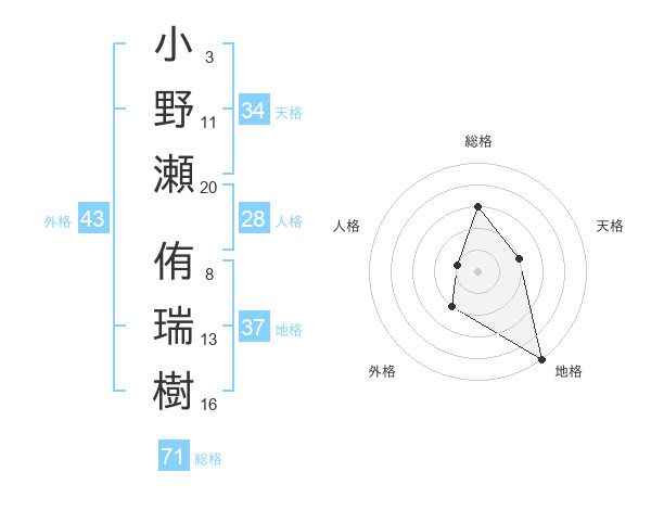小野瀬 侑瑞樹さんの総格は71画の3点!