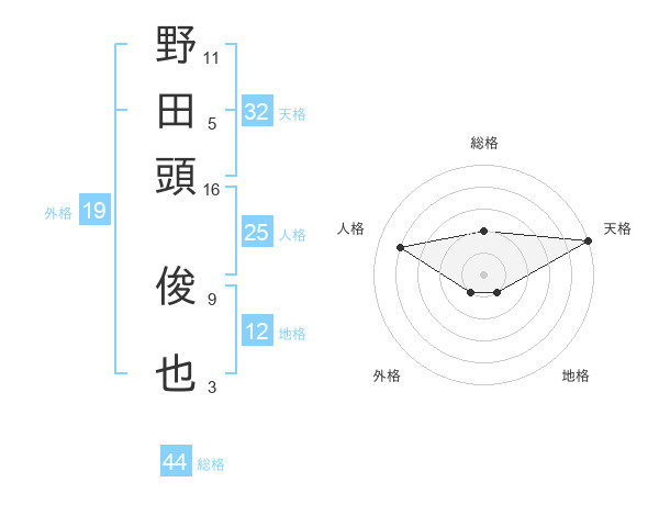 野田頭 俊也さんの総格は44画の2点!