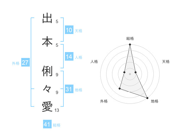 出本 俐々愛さんの地格は31画の5点!