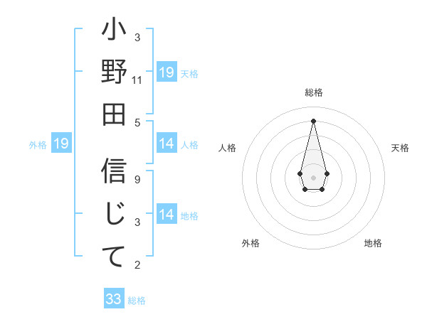 小野田 信じてさんを姓名の画数から五運を鑑定