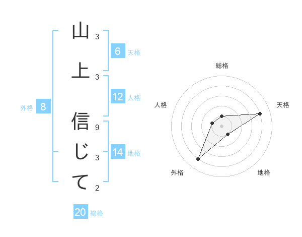 山上 信じてさんの総格は20画の1点!