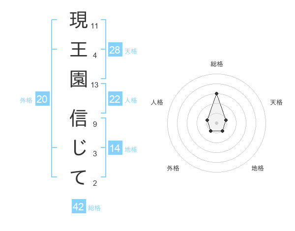 現王園 信じてさんを姓名の画数から五運を鑑定