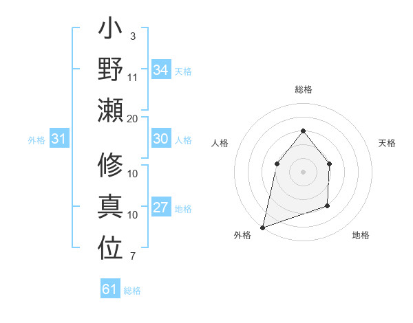 小野瀬 修真位さんを姓名の画数から五運を鑑定
