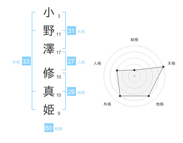 小野澤 修真姫さんの総格は60画の1点