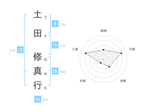 土田 修真行さんの総格は34画の2点