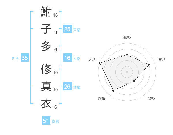 鮒子多 修真衣さんを姓名の画数から五運を鑑定