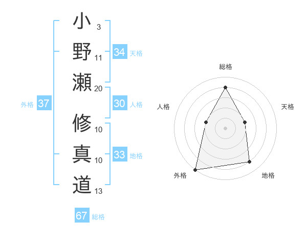 小野瀬 修真道さんの総格は67画の4点