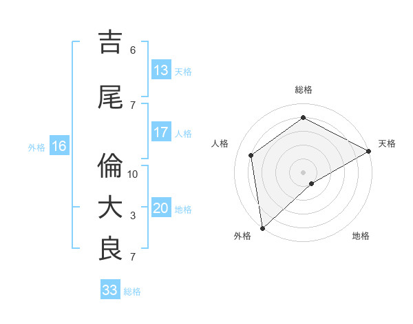 吉尾 倫大良さんの総格は33画の4点!