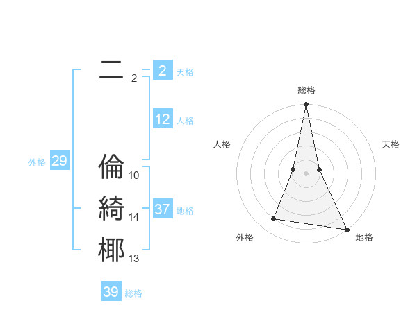 二 倫綺椰さんの総格は39画の5点!