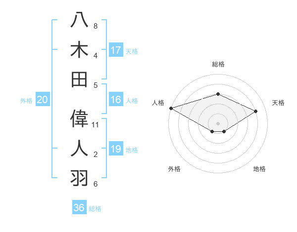 八木田 偉人羽さんを姓名の画数から五運を鑑定