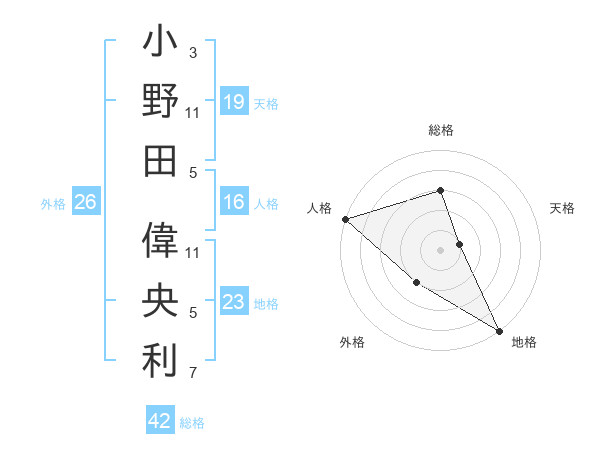 小野田 偉央利さんを姓名の画数から五運を鑑定