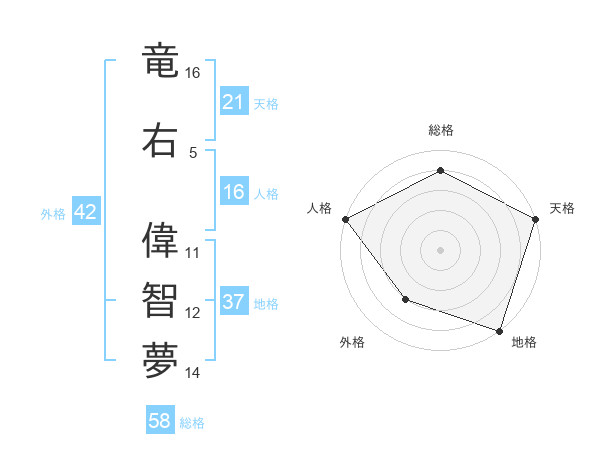 竜右 偉智夢さんを姓名の画数から五運を鑑定