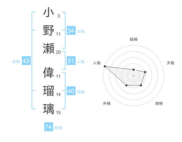 小野瀬 偉瑠璃さんの総格は74画の1点