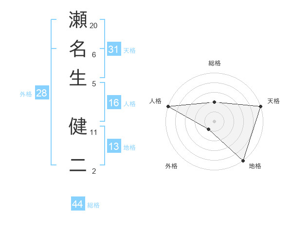瀬名生 健二さんの総格は44画の2点!