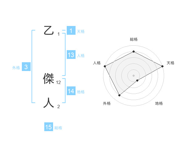 乙 傑人さんの総格は15画の4点