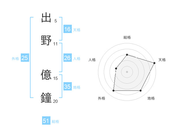 出野 億鐘さんを姓名の画数から五運を鑑定