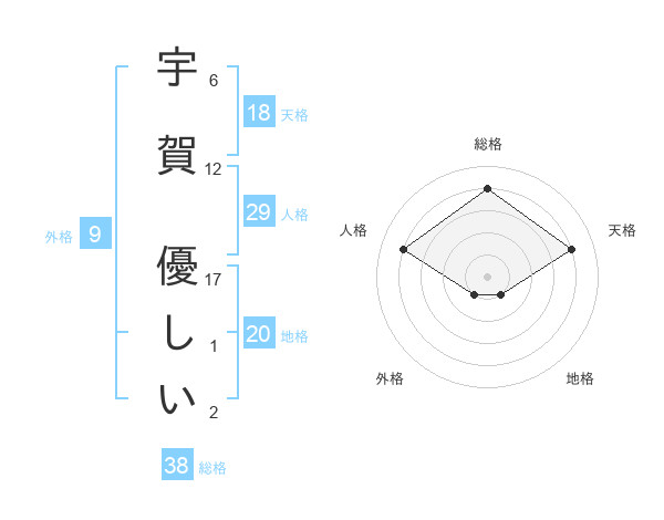 宇賀 優しいさんの総格は38画の4点!