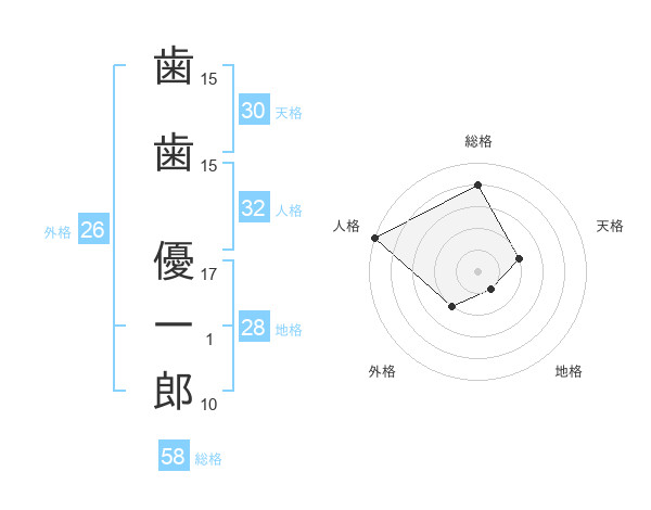 歯歯 優一郎さんの総格は58画の4点!