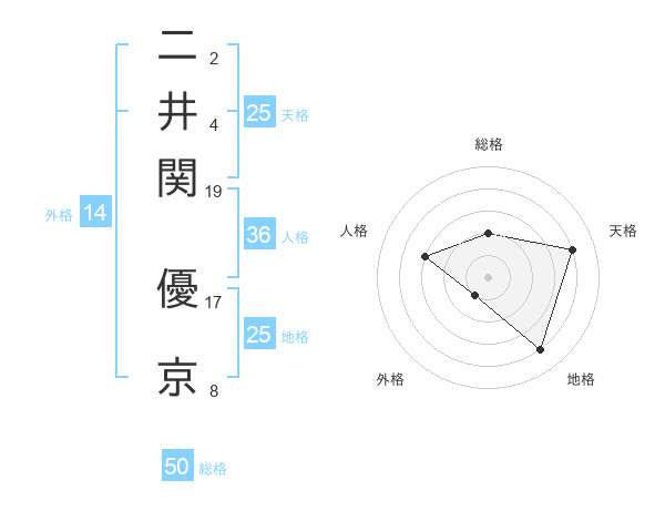 二井関 優京さんの地格は25画の4点!