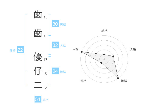 歯歯 優仔二さんの外格は22画の1点!