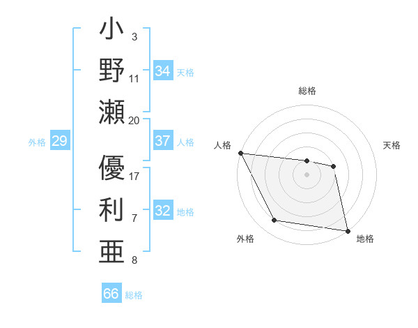 小野瀬 優利亜さんの総格は66画の1点!