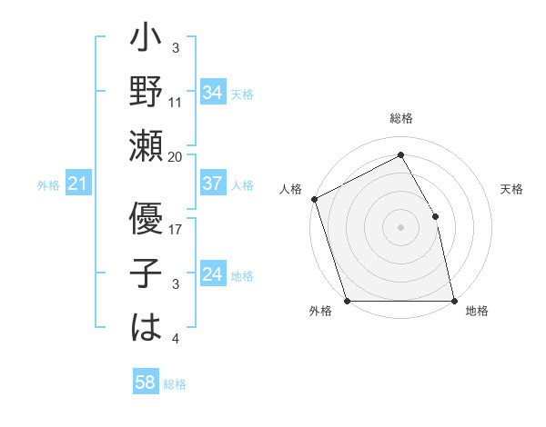 小野瀬 優子はさんの総格は58画の4点!