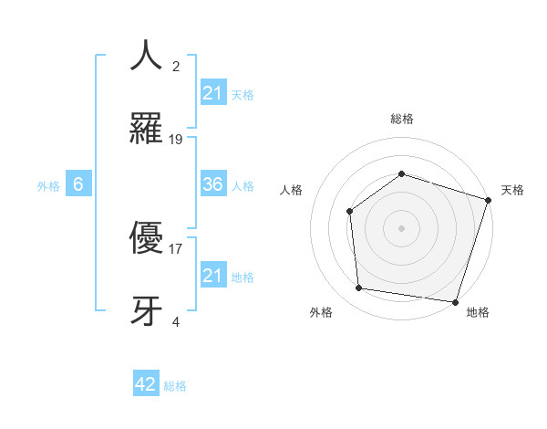 人羅 優牙さんを姓名の画数から五運を鑑定
