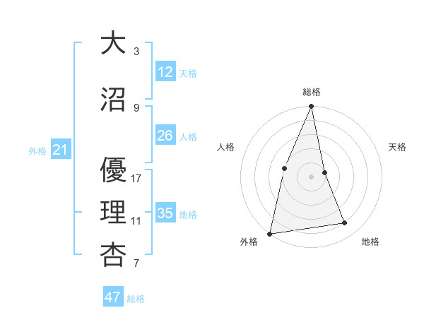 大沼 優理杏さんの総格は47画の5点!