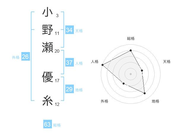 小野瀬 優糸さんの総格は63画の4点!