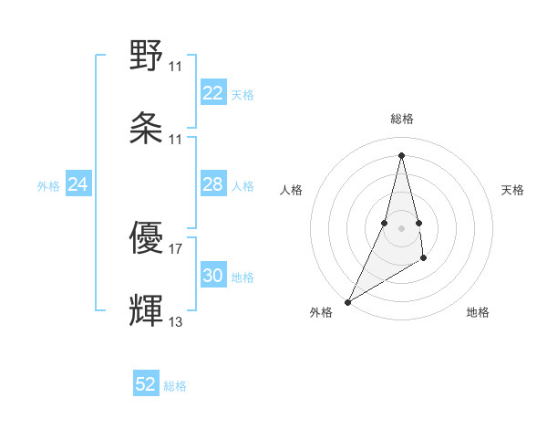 野条 優輝さんの総格は52画の4点!