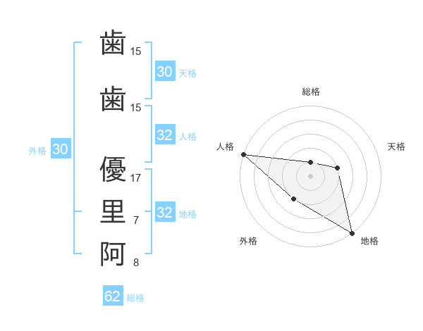 歯歯 優里阿さんの地格は32画の5点!