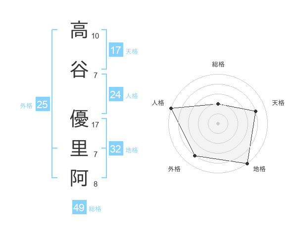 高谷 優里阿さんを姓名の画数から五運を鑑定