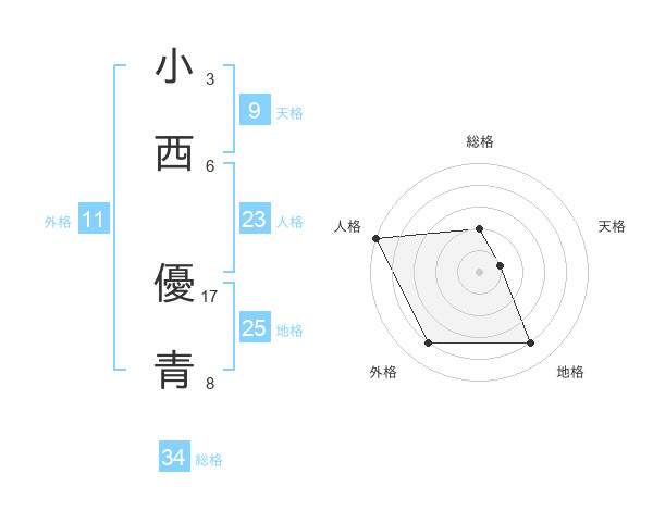 小西 優青さんの地格は25画の4点!