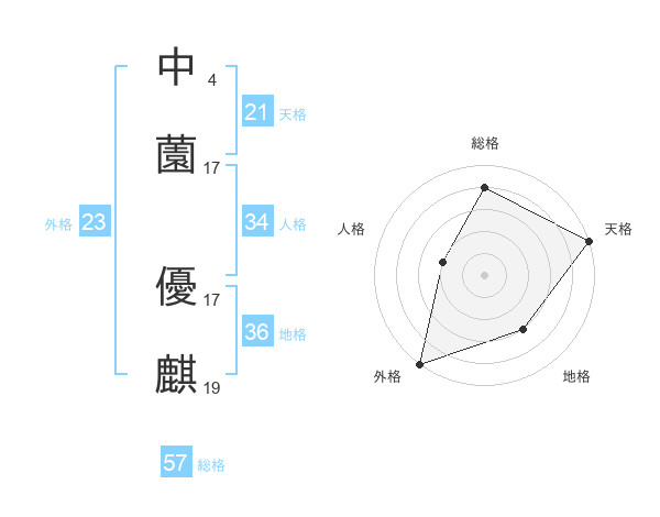 中薗 優麒さんの総格は57画の4点!