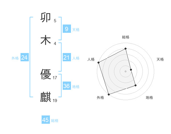 卯木 優麒さんの総格は45画の4点!