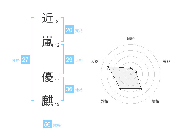 近嵐 優麒さんの総格は56画の1点!