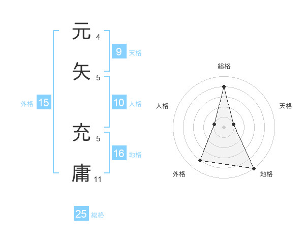 元矢 充庸さんの総格は25画の4点!