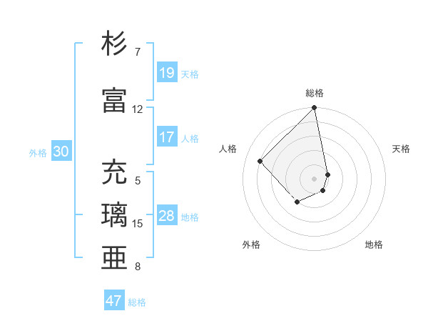 杉富 充璃亜さんの総格は47画の5点!