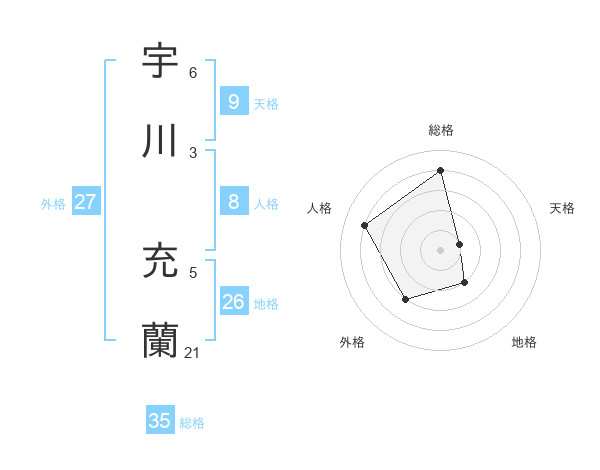 宇川 充蘭さんの総格は35画の4点!