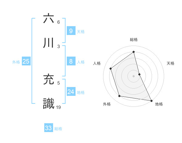 六川 充識さんの総格は33画の4点!