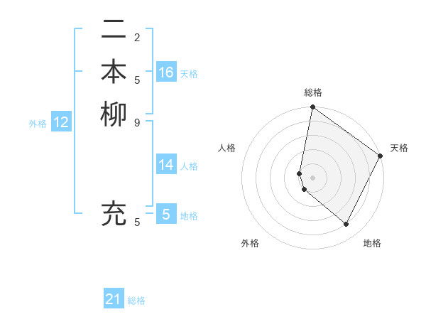 二本柳 充さんの総格は21画の5点!