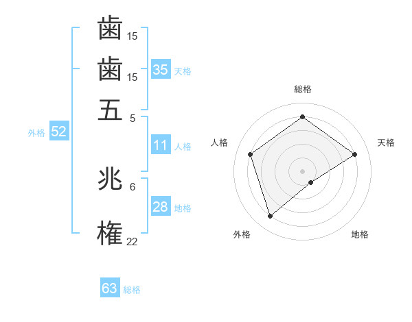 歯歯五 兆権さんの外格は52画の4点!