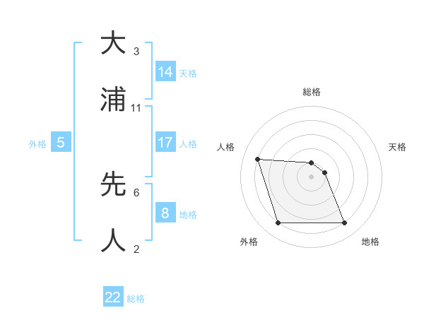 大浦 先人さんの総格は22画の1点!