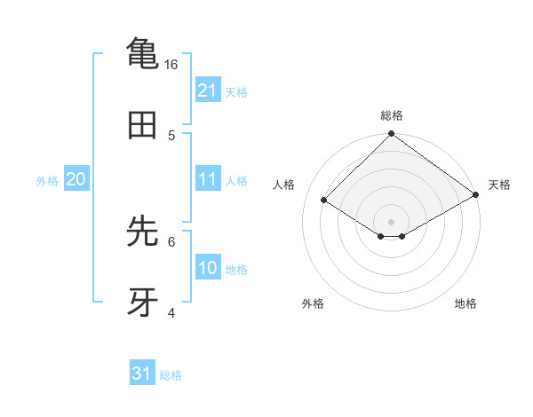 亀田 先牙さんを姓名の画数から五運を鑑定