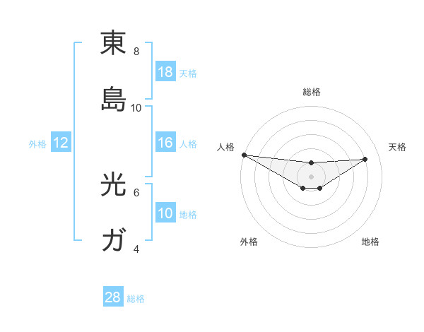 東島 光ガさんの総格は28画の1点!