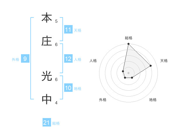 本庄 光中さんの総格は21画の5点!