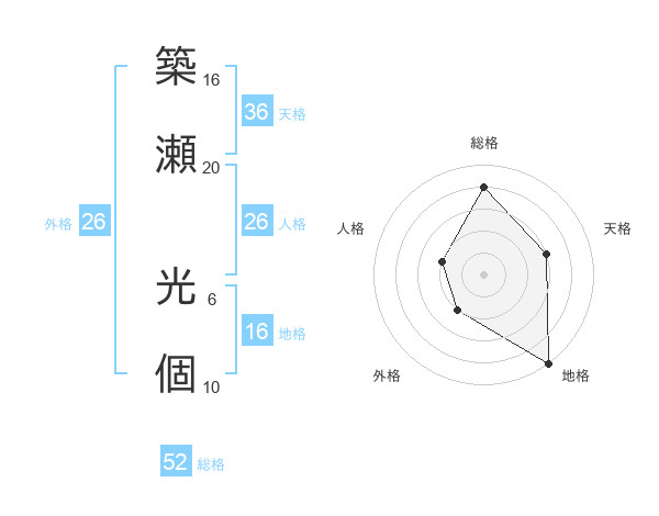築瀬 光個さんの総格は52画の4点!